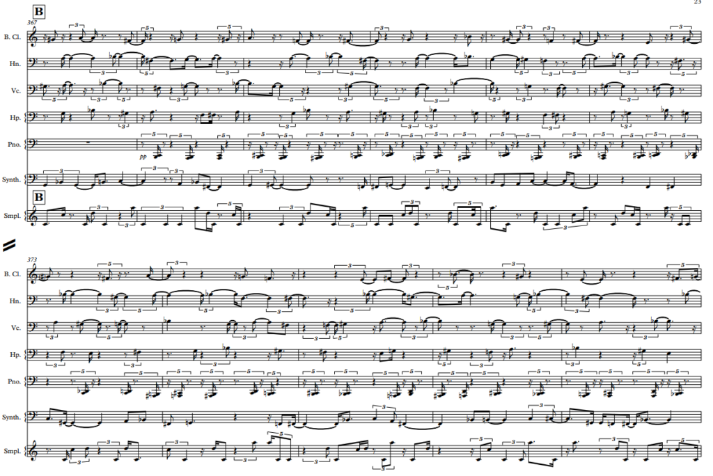 - Bass clarinet, Horn, Cello, Harp, Piano, Sampler